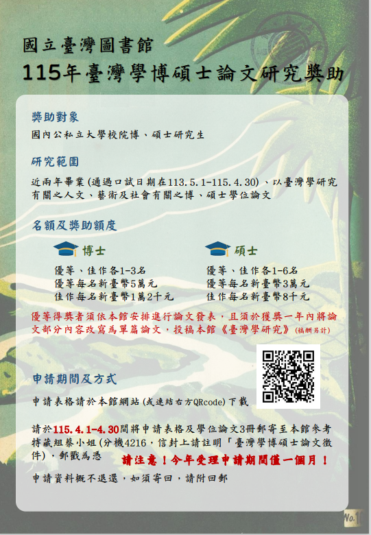 有關「115年臺灣學博碩士論文研究獎助要點」